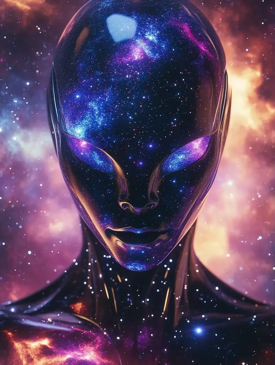 Generate a hyper-realistic 8K AI image of a cosmic cyborg alien emerging from a nebula. This ethereal celestial being features a star-formed face, shadow illusions, and dark galactic textures, blending mystery and sci-fi artistry for awe-inspiring deep-space visuals. Perfect for sci-fi enthusiasts and cosmic-themed projects.