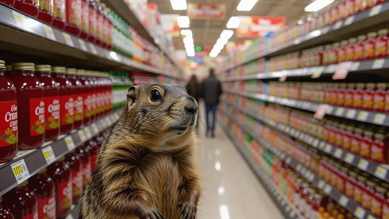 Create an AI-generated image of a groundhog hunting for cranberry sauce in a vibrant grocery store. Perfect for holiday visuals, quirky storytelling, or social media content. Use vivago.ai's creative AI tools to bring whimsical scenes to life with text-to-image magic and professional editing effects.