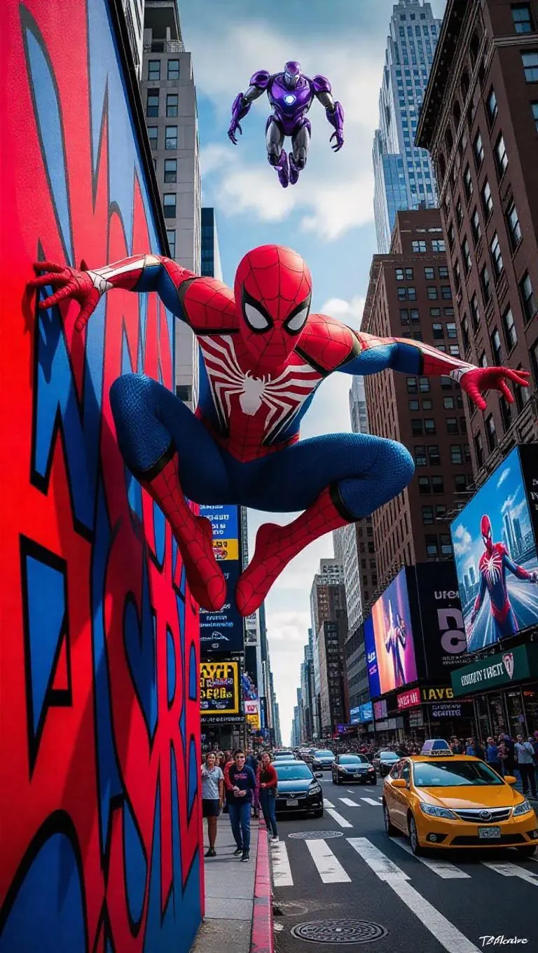 Explore AI-powered Spider-Man art with surreal NYC murals using Octane rendering. Vivago.ai generates vibrant thick CG-style superhero visuals featuring dynamic battles, glowing robotic threats, and detailed cityscapes. Enhance images with realistic web textures, elastic suit光泽, and cheering crowds. Optimized HD resolution ensures crisp details while avoiding cluttered layouts or dull color schemes in superhero digital art creation.