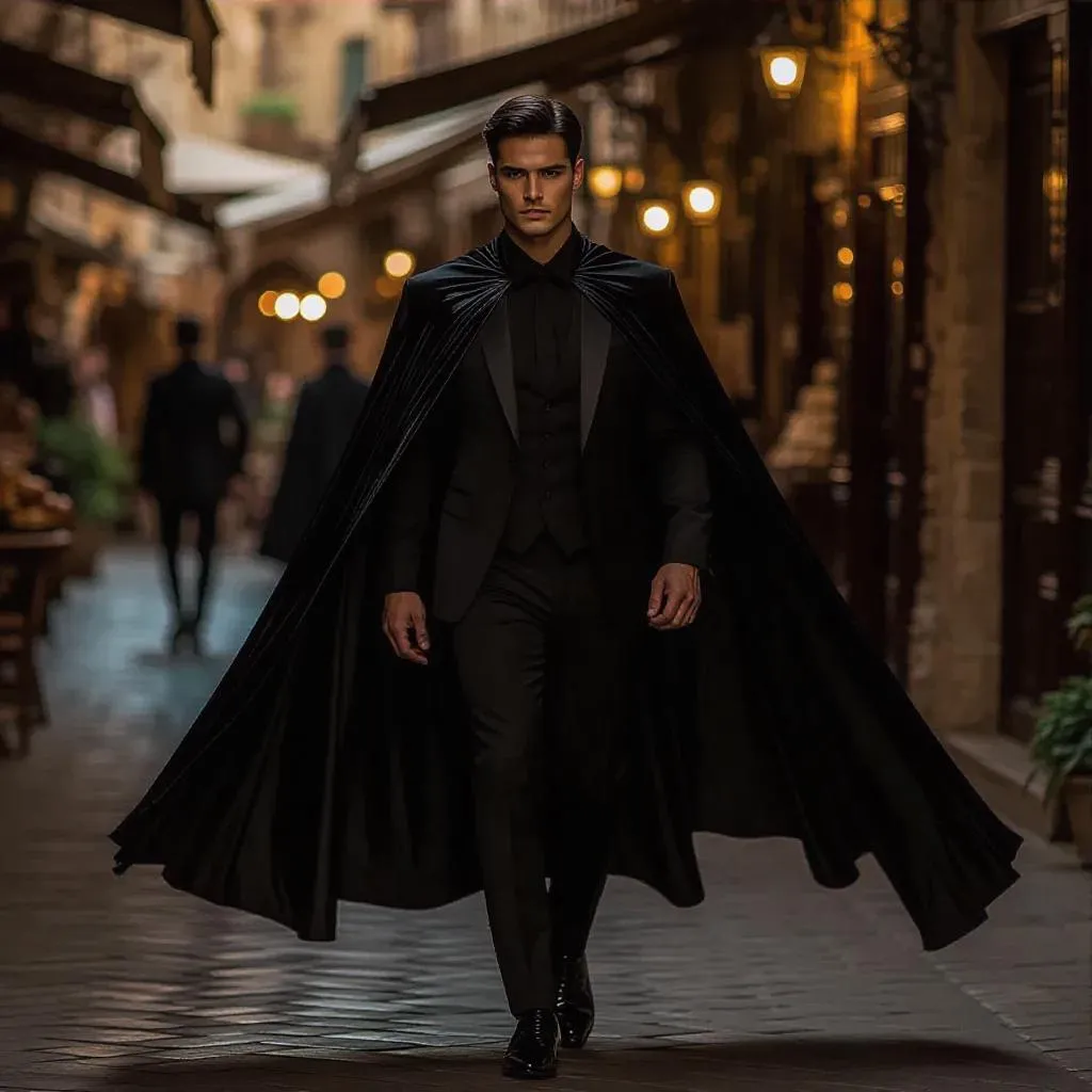 Generate hyper-realistic AI images of handsome male models with dramatic, glossy capes. Create photorealistic visuals featuring seductive poses, flowing capes in urban Barcelona settings, and cinematic lighting using advanced text-to-image AI. Perfect for creative photography and visual storytelling.