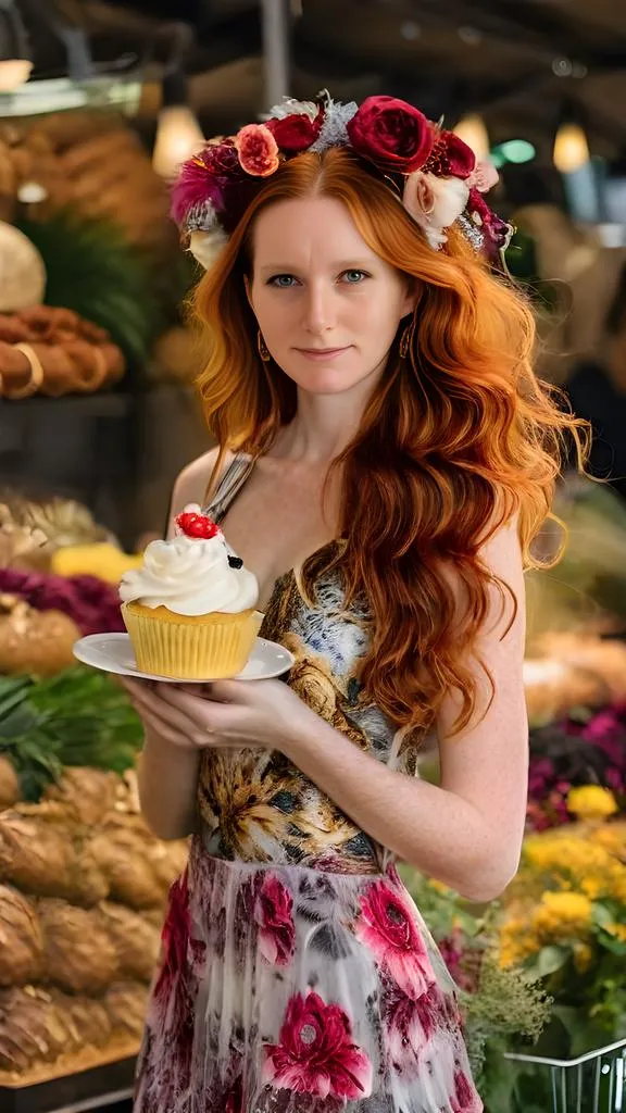 Vibrant rustic market scene brimming with fresh produce, artisanal goods, and a red-haired enchantress in a shimmering floral dress. She cradles a gold-dusted cupcake masterpiece amid warm, magical lighting. Dynamic symmetry composition highlights textures and whimsical charm, blending AI-generated artistry with fairytale allure for captivating visuals. Perfect for creative storytelling and professional-grade digital aesthetics.