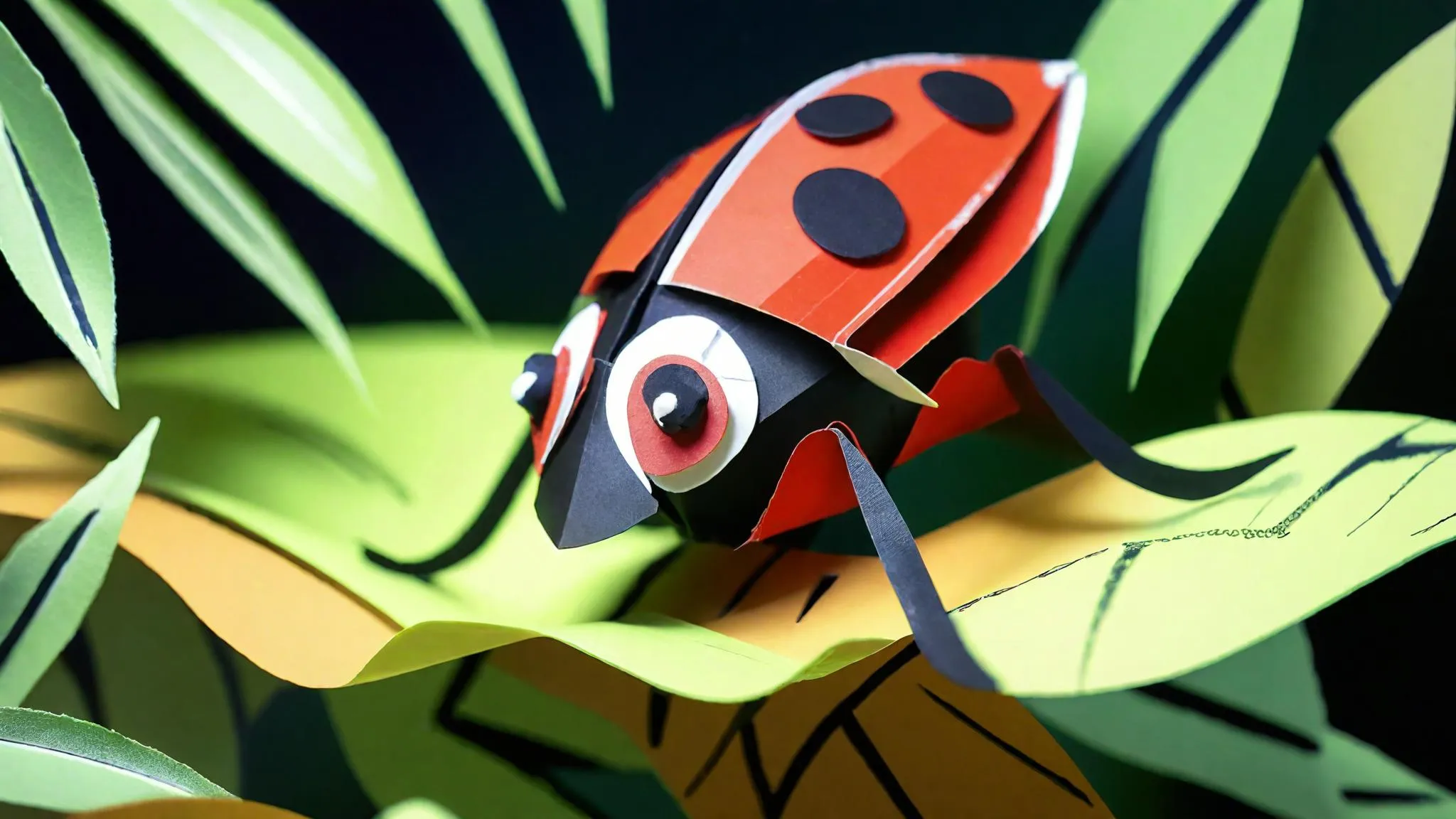 Create vibrant AI-generated origami art of a ladybug with red and white wings soaring over a banana leaf in a jungle setting. Craft unique, stylized visuals using AI tools for eye-catching digital designs, blending nature-inspired elements and geometric precision. Perfect for artistic projects or dynamic content creation.