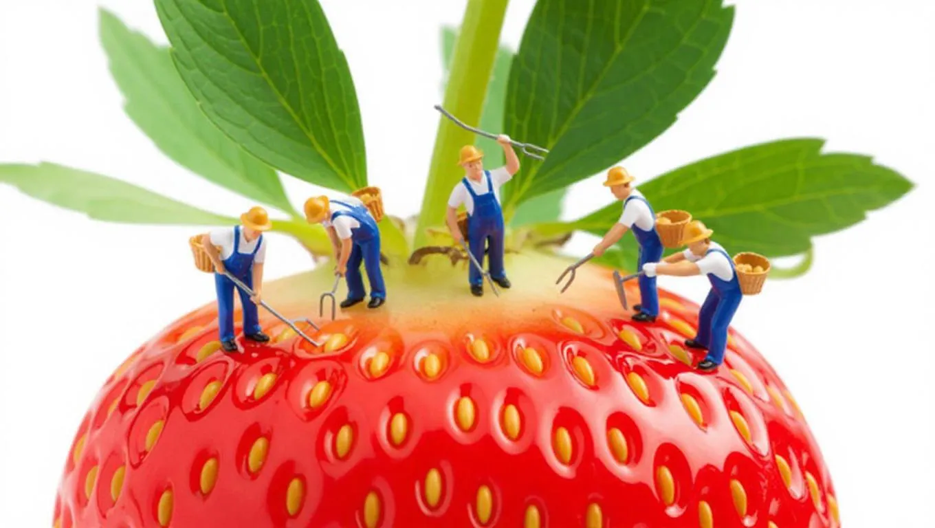 Generate AI images of miniature farmers harvesting golden strawberry seeds with tweezers on hyper-detailed giant strawberries. Explore vivago.ai's AI effects for surreal agricultural scenes, transforming text prompts into professional-grade visuals with intricate textures and whimsical storytelling elements.