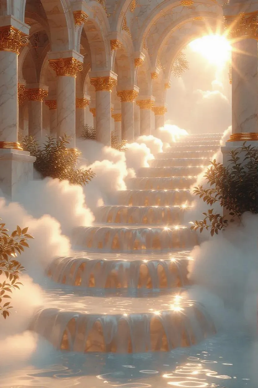A cascade of alabaster arches gilded with fractal gold filigree spans floating garden cliffs where waterfalls of liquid dawn pour into endless cloud abysses, dissolving into opalescent vapor. Radiant sunrise fractures through perforated marble colonnades, casting honeyed halos over levitating pavilions draped in crystallized ivy that hums with embedded sunlight. Obsidian bridges studded with amber cabochons cross chasms where cloud rivers spiral into fractal whirlpools, their mist rising as bioluminescent vapors to halo floating quartz staircases ascending toward a roseate aurora. Polyart's ultra-saturated matte palette renders dendritic cobalt veins in marble piers, the peach-gold radiance caught in waterfall mist, and the fractal shimmer of levitating silt in cloud pools—all framed vertically to emphasize vertiginous drops through the 2:3 aspect, where distant spirit-kites glide through the serene silence.
