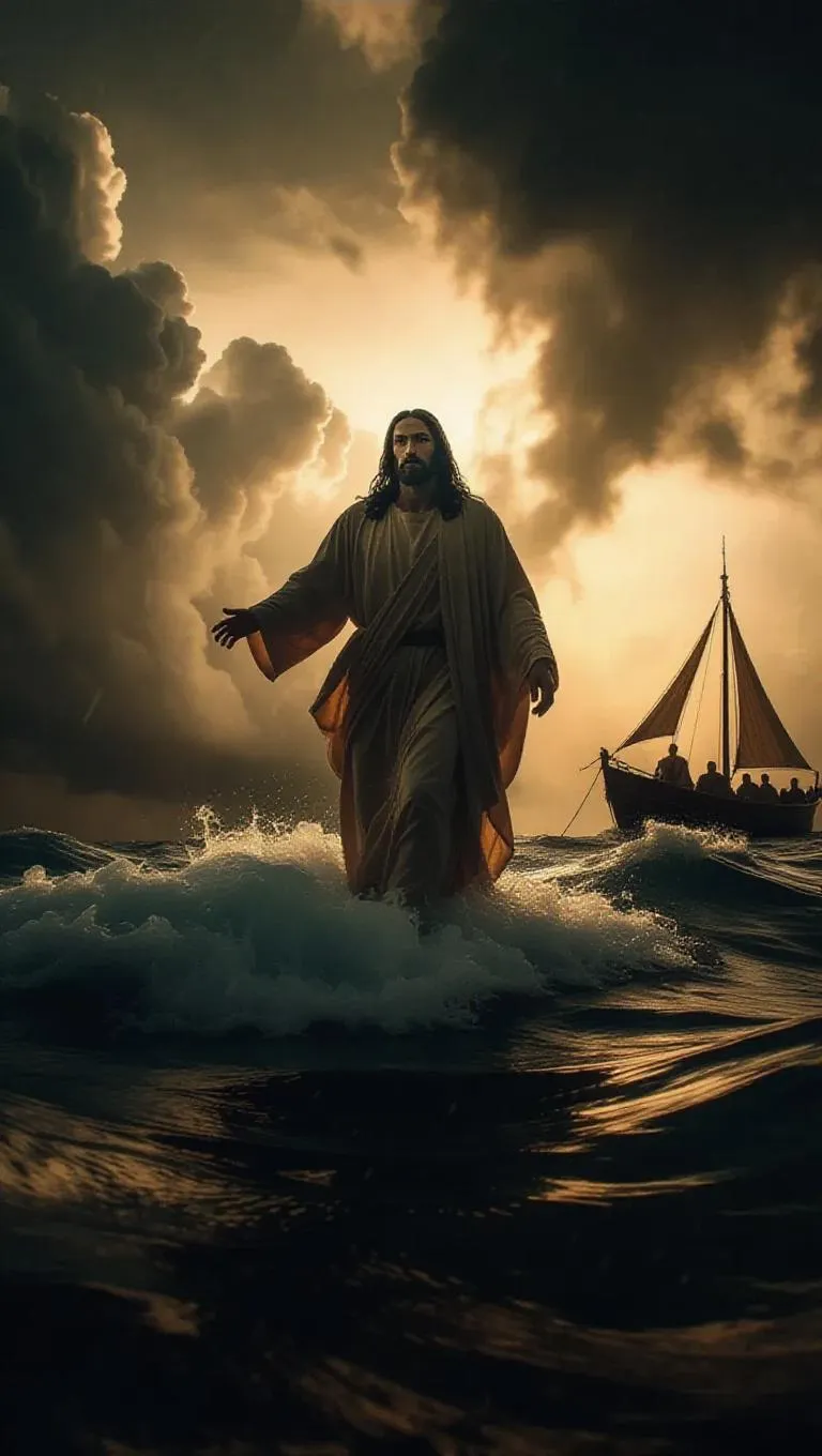 Create AI-generated art of Jesus walking on stormy waters with dark clouds, a turbulent sea, and a fishing boat nearby. Inspire awe with hyper-realistic details, dramatic lighting, and expressive fishermen. Perfect for biblical storytelling, spiritual themes, or dramatic visual projects. Transform prompts into vivid visuals with AI precision. Elevate your creative vision today.