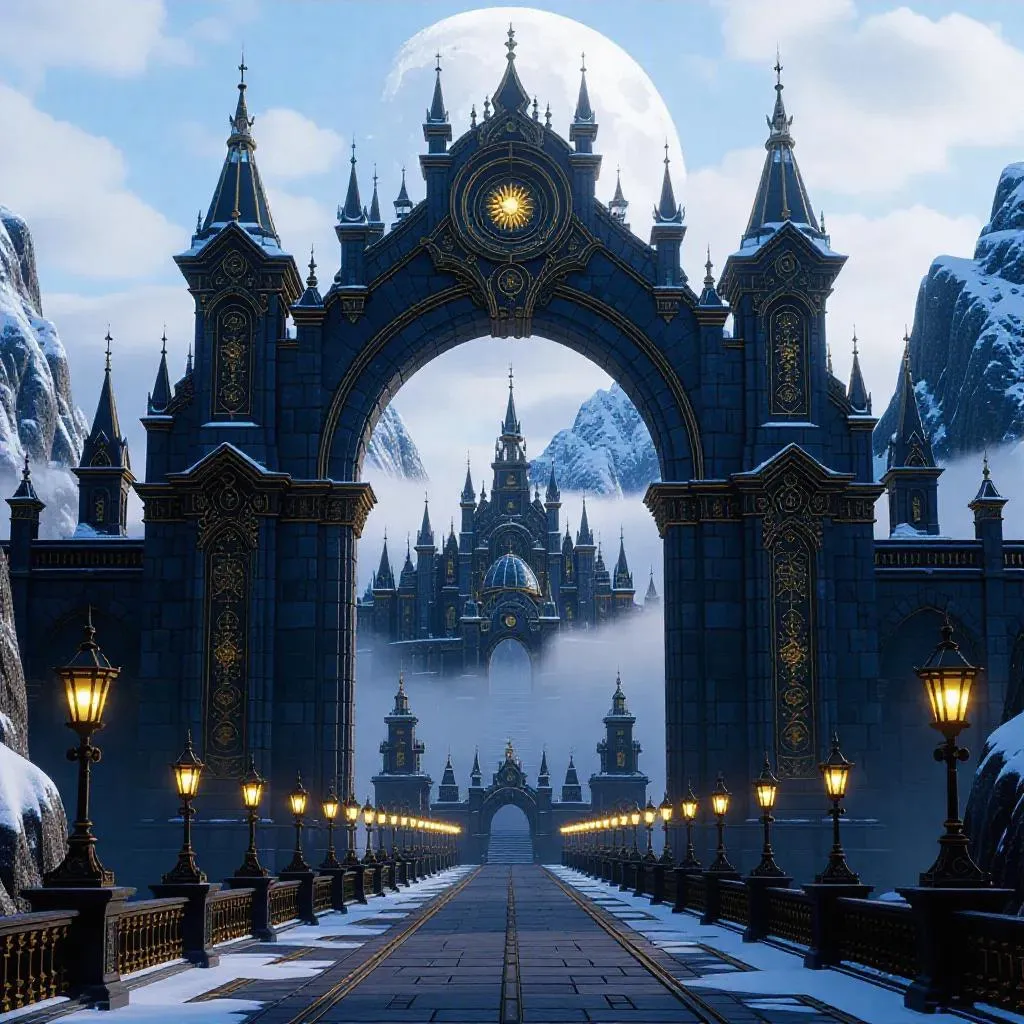 Explore the Citadel of the Heavens through AI-generated splendor: a moonlit Gothic citadel with golden spires, domes, and misty mountains. Vivago.ai transforms text prompts into mystical visuals, crafting celestial landscapes with intricate stone arches, lantern-lit paths, and ethereal moonlight effects for breathtaking, otherworldly imagery.