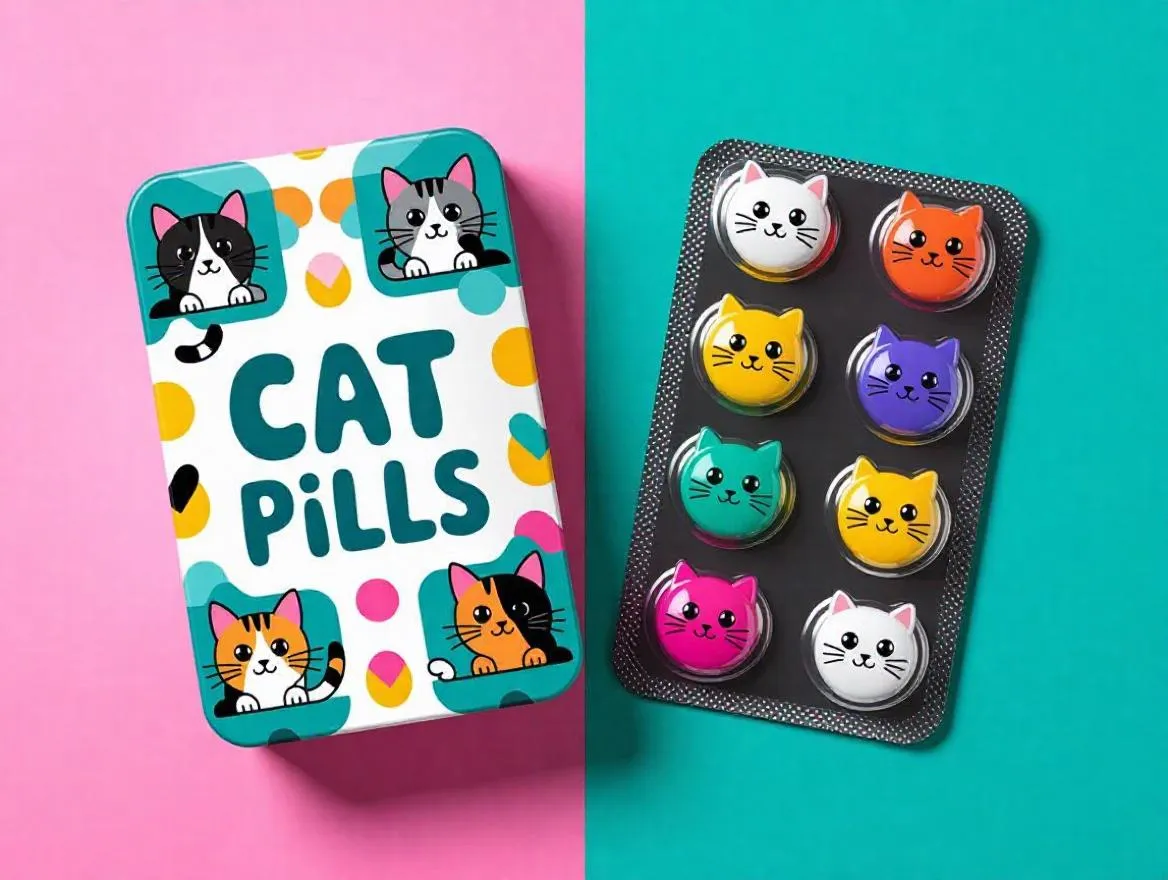 Discover whimsical cat-themed pill packaging blending medical precision with playful charm. Features bold "Cat Pills" labels, modern illustrations of lounging felines, and a blister sheet with six colorful, cat-shaped tablets. Perfectly merges creative design and pharmaceutical functionality for eye-catching, adorable medication solutions. Ideal for pet lovers seeking quirky, artistic pill packaging designs.