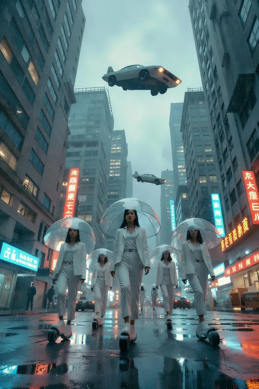 On a rainy day, a retro-style city street is captured from a wide-angle upward angle. Asian office workers, dressed in white and looking exhausted, walk toward the camera on wheeled shoes, each covered by a transparent, rainproof glass dome. Towering 1990s-style office buildings loom in the background, with teleportation channels and vintage flying cars, reminiscent of the Dodge Challenger, soaring overhead. Soft, diffused natural light filters through the rain, creating a moody, futuristic atmosphere. The scene blends elements of cyberpunk and retro aesthetics, emphasizing a blend of old and new technology.