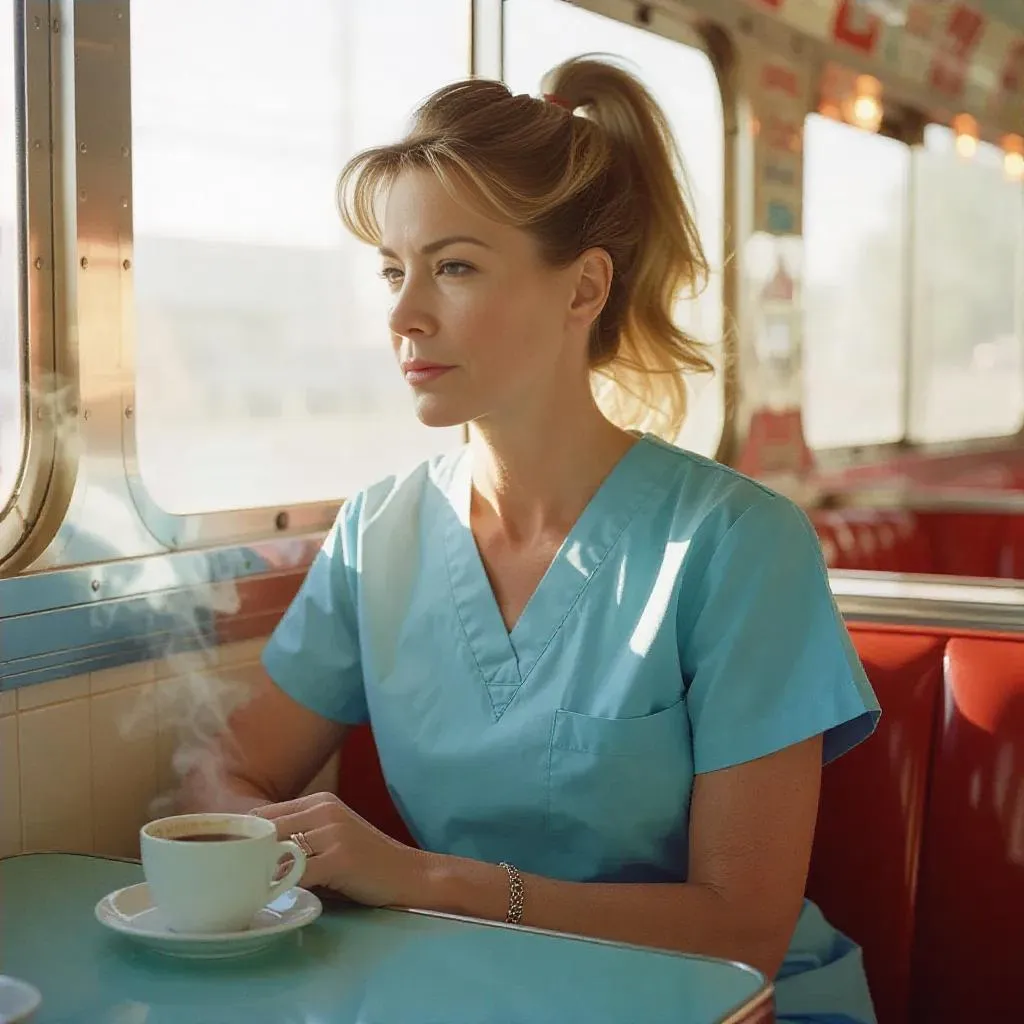 Generate an AI image of Annette Benning as a blonde nurse with a ponytail, wearing blue scrubs in a retro diner booth. This AI-generated scene features a coffee cup on the table, crafted with advanced text-to-image technology. Elevate your creative projects with VivaGo's professional AI effects for realistic character portrayals and immersive visual storytelling.