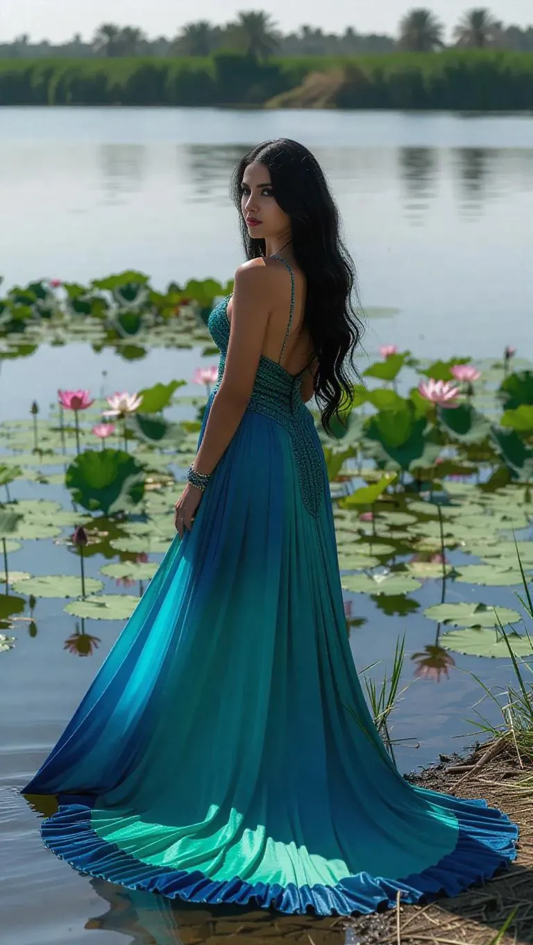 Create mystical AI-generated art of a Nile River goddess with flowing water-like features, vibrant aquatic textures, and lush Egyptian riverbanks. Perfect for mythology-inspired visuals, serene water deity designs, and AI-powered creative projects blending ancient elegance with natural beauty.