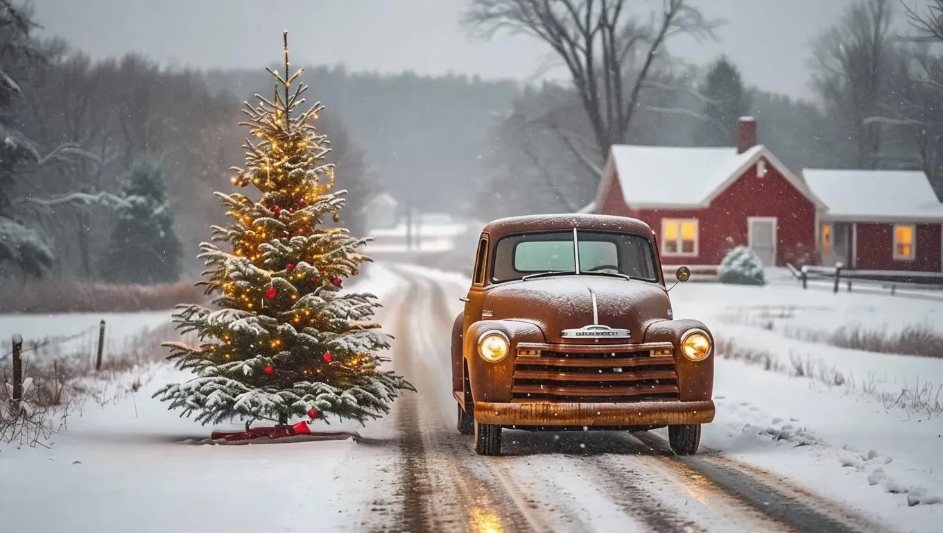 Generate a nostalgic Christmas scene with Vivago.ai's AI image generator. Transform text prompts into a snowy winter country road featuring a vintage Chevy truck and freshly-cut pine tree. Use our festive AI effects and editing tools to craft professional holiday visuals instantly.