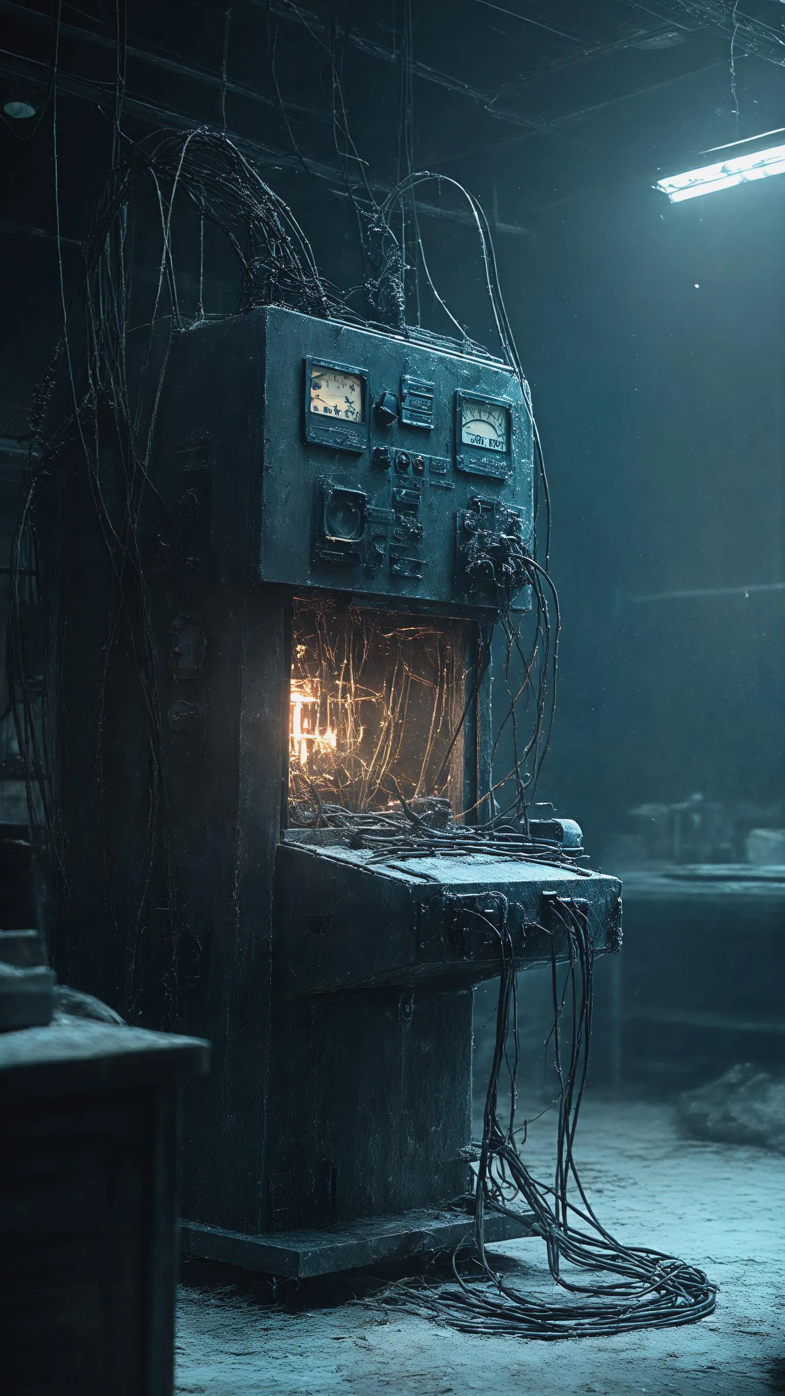 Generate eerie AI images of an abandoned lab with a dormant yet alive machine pulsing internally. Capture cinematic horror realism: deep shadows, oppressive silence, high contrast lighting, soft film grain. Create this dark, atmospheric scene using Vivago.ai's powerful text-to-image generator for professional visuals. Perfect for horror & sci-fi concepts.