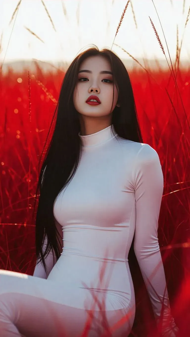 Craft AI-generated cinematic still images with glowing surreal portraits. Transform prompts into fine art photos featuring Asian women in sleek white bodysuits amid shining red grass, minimalist studios, and redscale lighting. Achieve professional-grade visuals through AI-powered image generation, combining soft studio lighting, dark red-white contrasts, and ethereal atmospheres for striking, avant-garde photography.