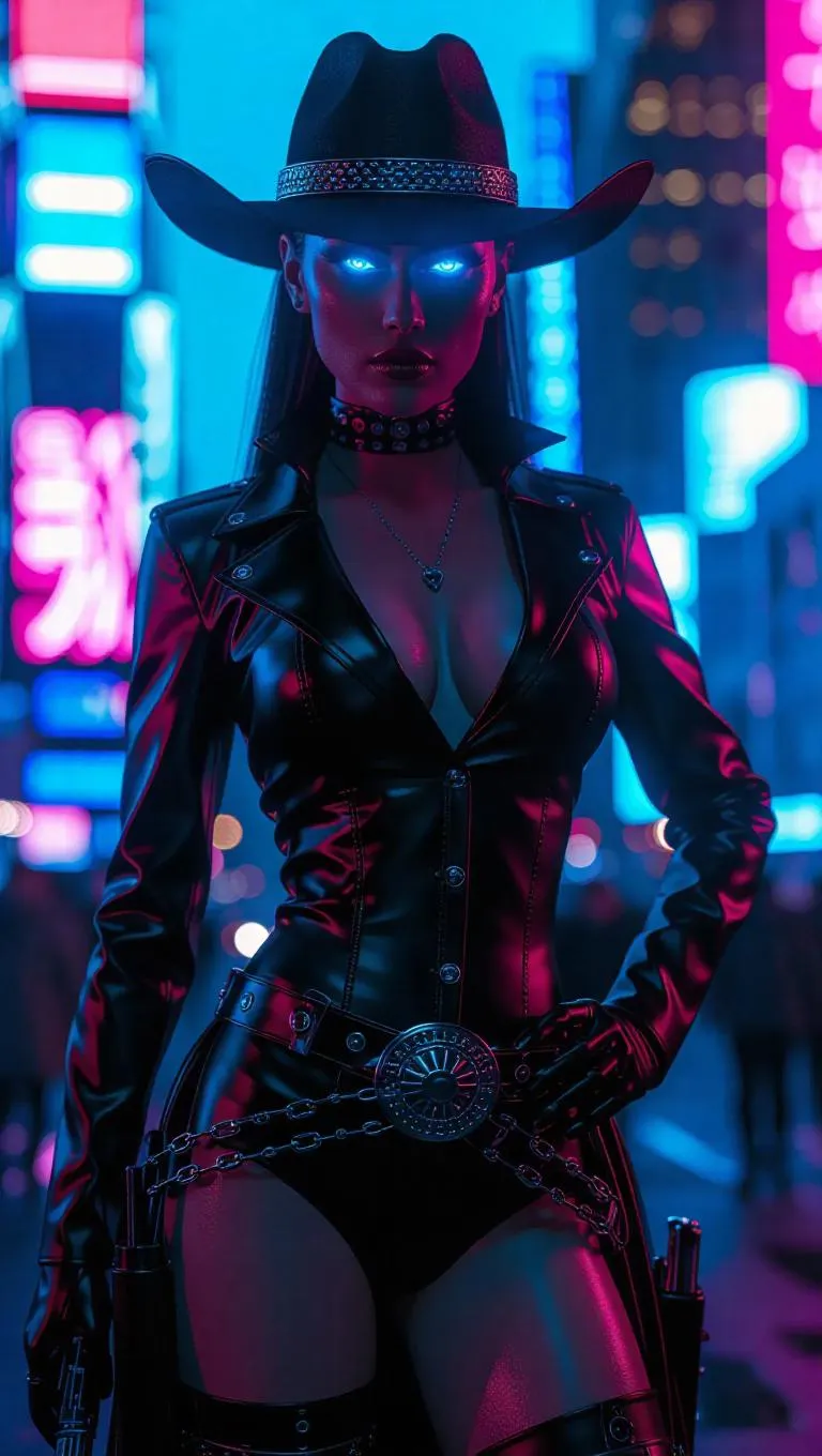 Transform text into striking visuals with Vivago.ai's AI tools. Create a futuristic AI agent in a neon cyberpunk cityscape, featuring glowing blue eyes, sleek attire, stilettos, and edgy accessories like a lasso belt and six-shooter. Generate your AI vision with professional-grade effects.