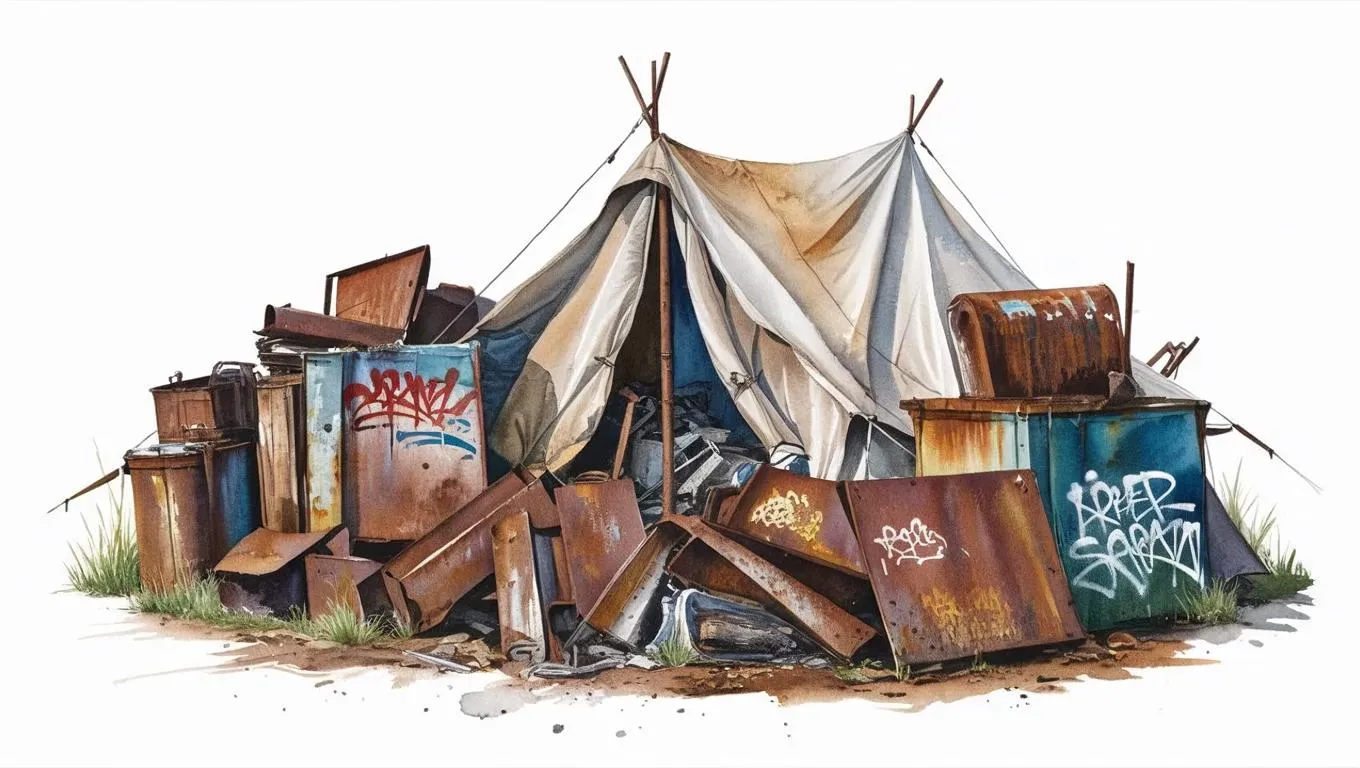 Create a striking 2D sketched and watercolor illustration of a tent surrounded by rusty metal junk, blending delicate textures with urban grit. This AI-generated artwork features a stark white minimalist background contrasted by edgy graffiti accents, perfect for edgy designs, concept art, or dystopian-themed projects. Generate this mixed-media aesthetic instantly with VivaGo's AI image tools.