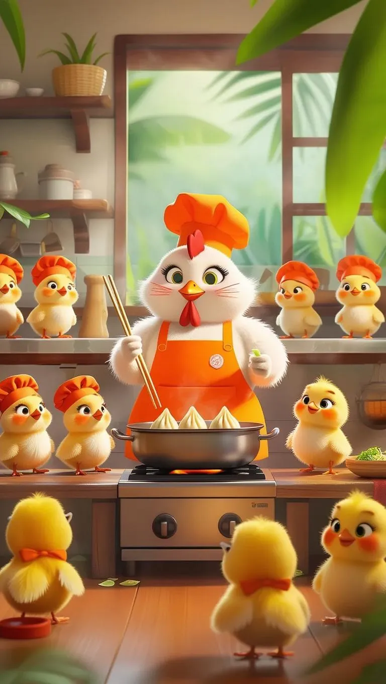 Generate a vibrant cartoon scene with AI: cartoon hen chef in orange apron cooks momos in a jungle kitchen. Baby hens wear matching chef hats, holding chopsticks on counters. Cozy, bright setting with hot pot details. Create playful animal cooking visuals using professional-grade AI tools. Perfect for whimsical storytelling and creative visuals. Explore vivago.ai's AI image generator for vivid, imaginative scenes.