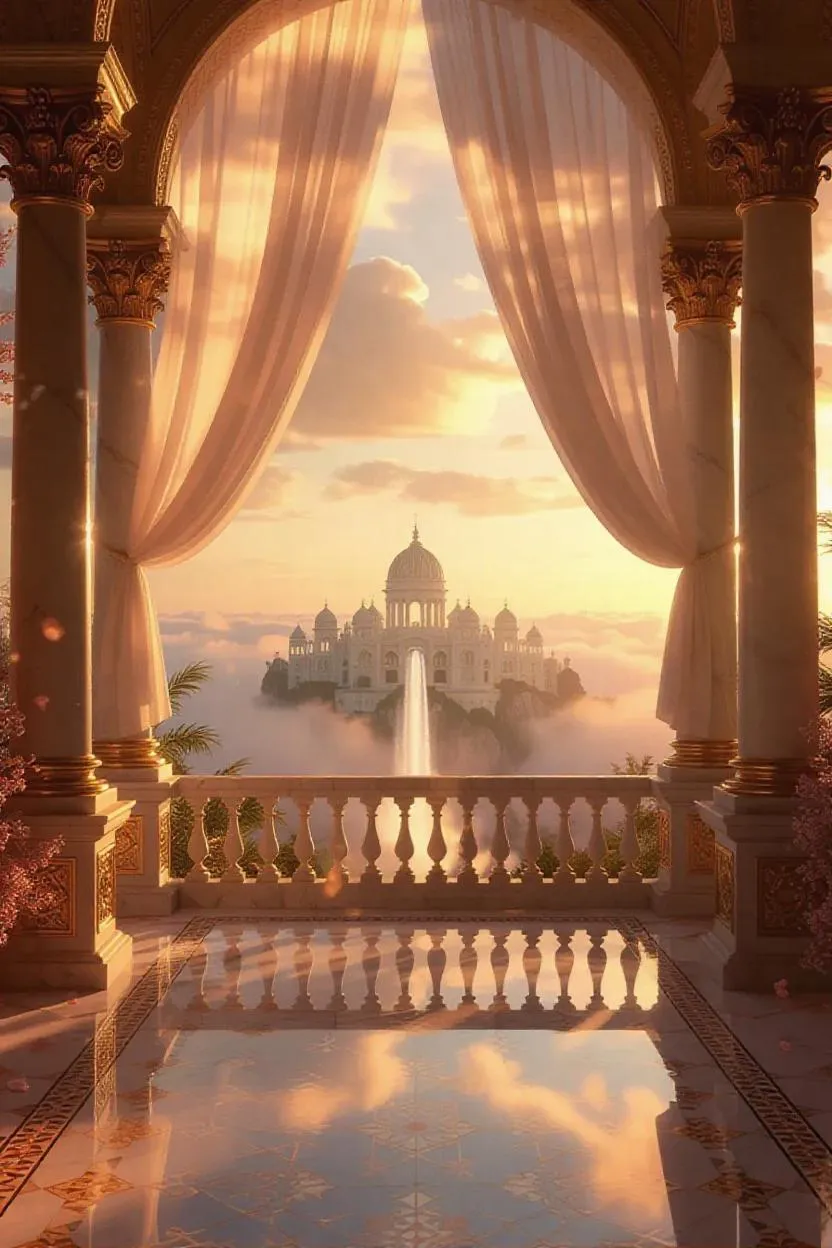 A majestic palace veranda with soaring alabaster columns framing billowing translucent silk curtains caught in a perpetual warm breeze, revealing panoramic views of candyfloss clouds in peach and rose-gold gradients. Below the intricate mosaic floor, celestial islands drift through cotton-candy skies, their terraced gardens cascading iridescent waterfalls that dissolve into prismatic mist. Soft-focus magic permeates the air as luminescent pollen drifts from floating blossom trees, petals swirling around carved jade balustrades adorned with celestial maps in gold leaf. Rendered in Polyart’s signature blend of hyper-saturated pastels and matte painterly textures, the 2:3 vertical composition emphasizes towering celestial arches glowing with bioluminescent runes against a twilit sky where winged spirits dance between crescent moons.