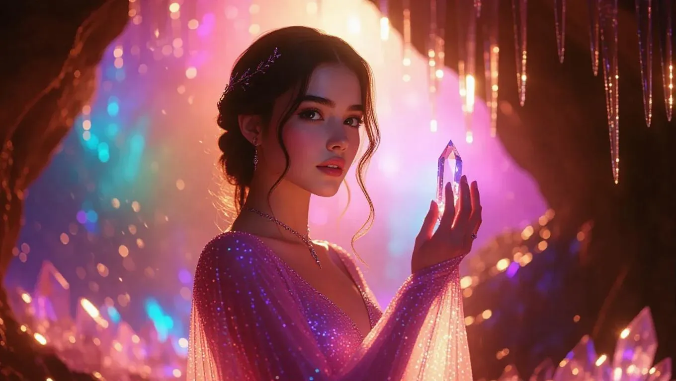 A delicate crystal sorceress stands in a kaleidoscopic cavern, surrounded by shimmering iridescent walls, with glittering crystalline shards raining down, refracting rainbow light. Wispy tendrils of mist curl around her slender fingers, and embedded crystal facets reflect and amplify her gentle, pulsing magic, captured in a breathtaking, wide-angle, hyper-realistic fantasy shot.