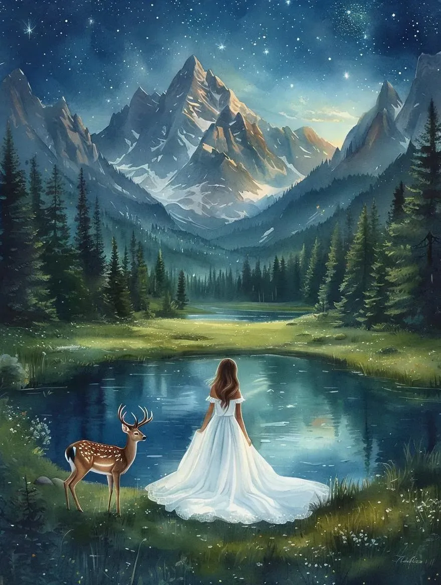 Create enchanting fantasy visuals with AI: mystical night scene of a girl in a white dress swimming in a forest lake, surrounded by meadows, towering mountains, and a curious deer. Transform text into dreamy imagery using vivago.ai's advanced AI tools for ethereal, professional-grade art.