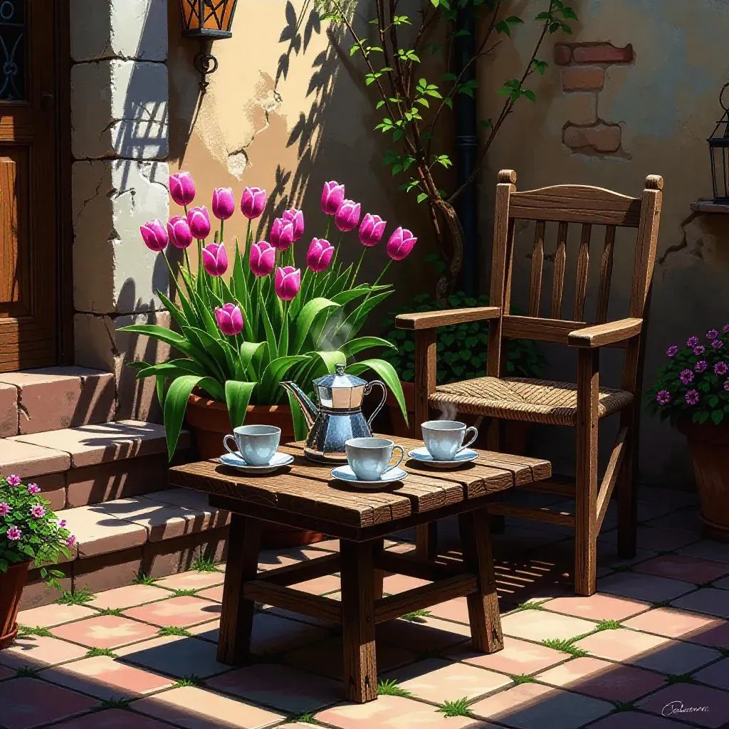 A charming small courtyard, featuring a rustic coffee table with a weathered chair, a steaming coffee pot, and delicate cups arranged neatly. Vibrant tulip plants add a pop of color, enhancing the serene and inviting atmosphere. High-quality, detailed brushstrokes capture the essence of a tranquil outdoor retreat.