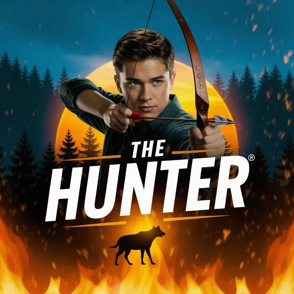 Create a dynamic AI-generated film logo for "The Hunter" featuring a fierce young protagonist. Design cinematic visuals with text-to-image AI tools, blending high-resolution graphics, dramatic typography, and intense atmospheric effects. Perfect for filmmakers seeking bold, modern branding. Explore vivago.ai's AI generators for custom logos.