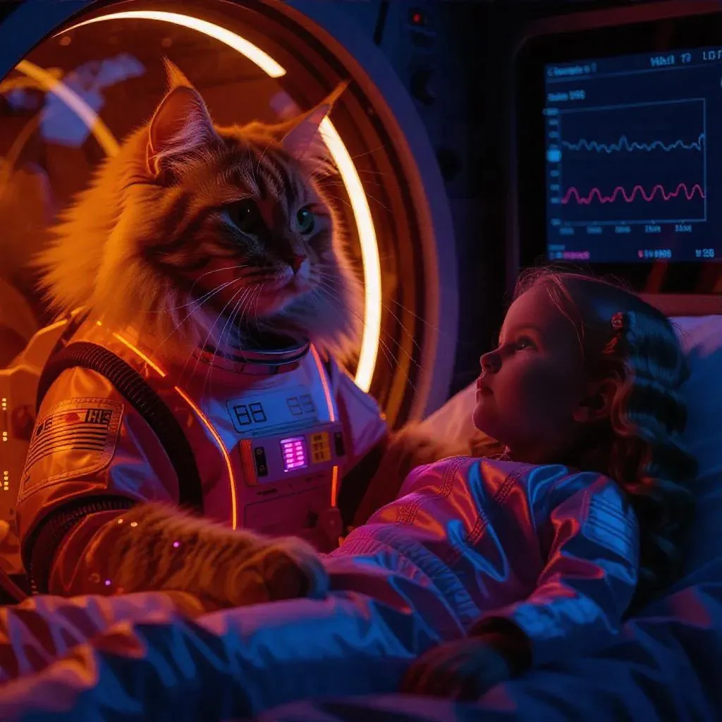 Futuristic cyberpunk scene featuring an anthropomorphic ginger cat in a neon-glowing space-age jumpsuit monitoring a sleeping blonde girl inside a transparent health capsule. Highlights intricate futuristic outfits, holographic health data displays, and advanced biotech elements. AI-generated high-resolution imagery blending sci-fi aesthetics with imaginative character design for immersive visual storytelling.