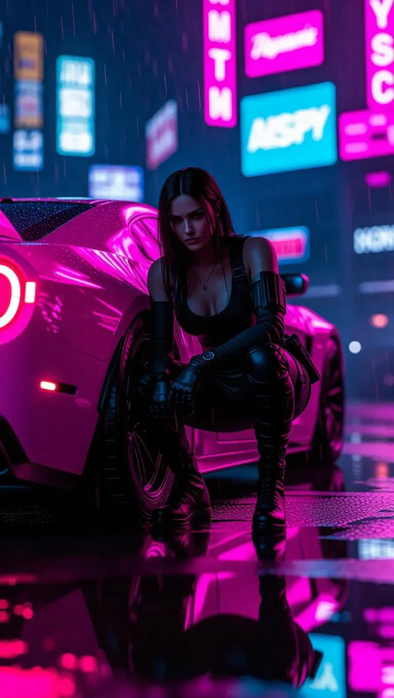 Create hyperrealistic cinematic scenes of GTA VI's Lucia in a neon-lit standoff with AI. Features rain effects, wet pavement reflections, pastel neon tones, dynamic depth of field, urban tactical fashion, and glowing digital ads. Perfect for vibrant, gritty game art using AI-powered editing tools.