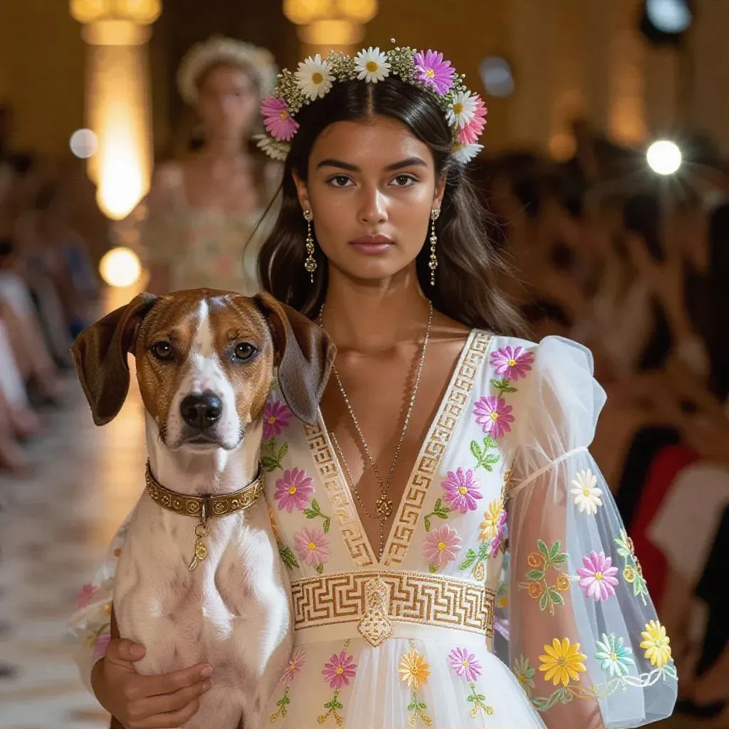 Vivago.ai crafts AI-generated Paris fashion runway scenes blending haute couture with ancient Greek Easter themes. Featuring a graceful model & Kokoni race dog in flowing pastel dresses with Greek key embroidery. Delicate wildflower crowns & serene yet powerful ambiance merge modern design with timeless Hellenic elegance.