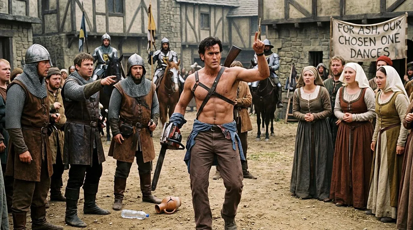 Ash dancing like Techno Viking.He drop his shirt and dancing to the guards and ladies around in medieval agae.Make him dancing like Techno Viking style
