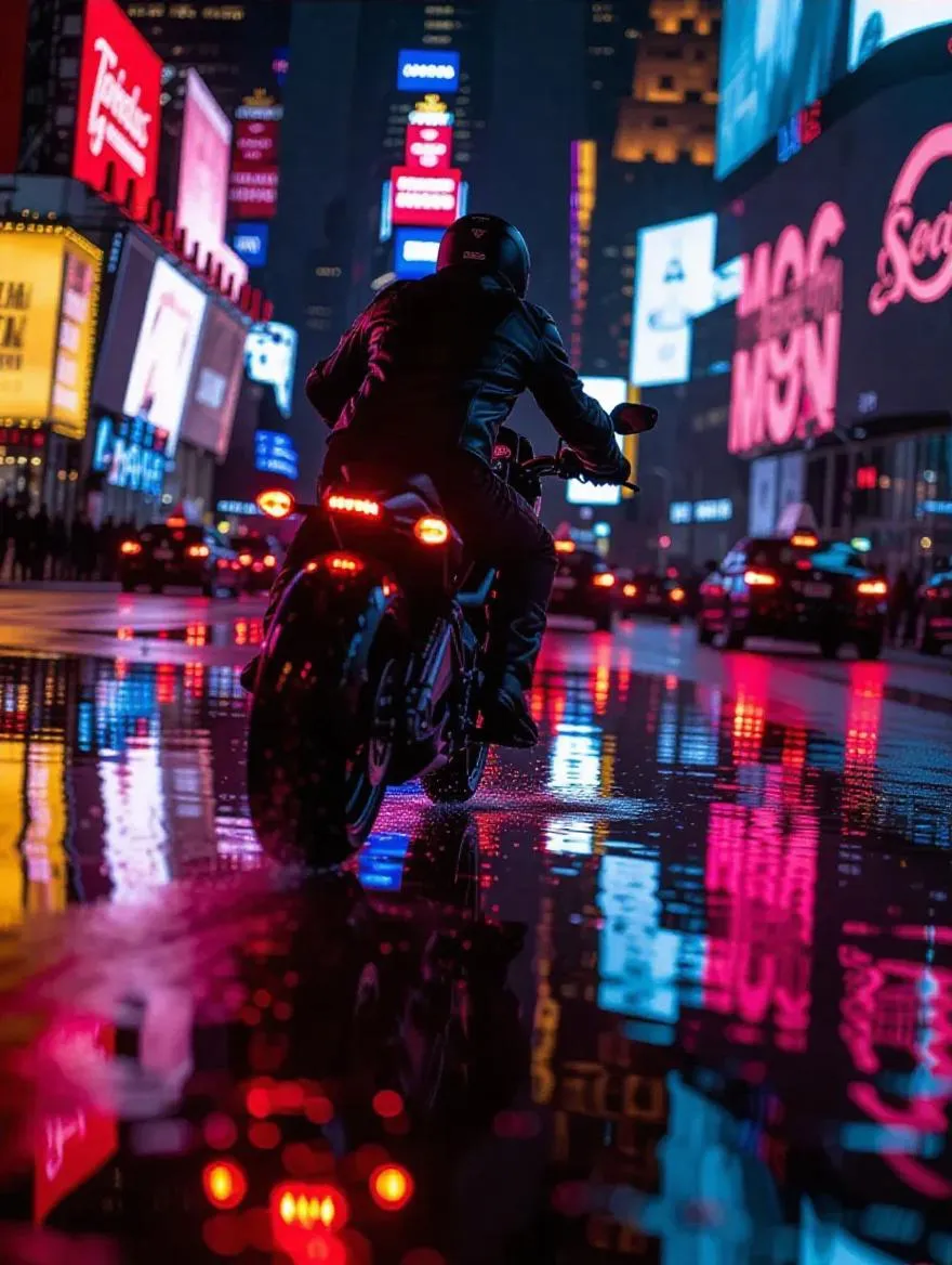 A lone motorcyclist in a black leather jacket races down a rain-slicked boulevard, backlit by exploding streetlights and flickering billboard chaos. Digital reflections shimmer across puddles, with a chain of patrol cars twisting through city shadows. Motion-capture angle from below, sparks trailing from the tailpipe, dramatic shallow depth of field, neon hues blending into the night.