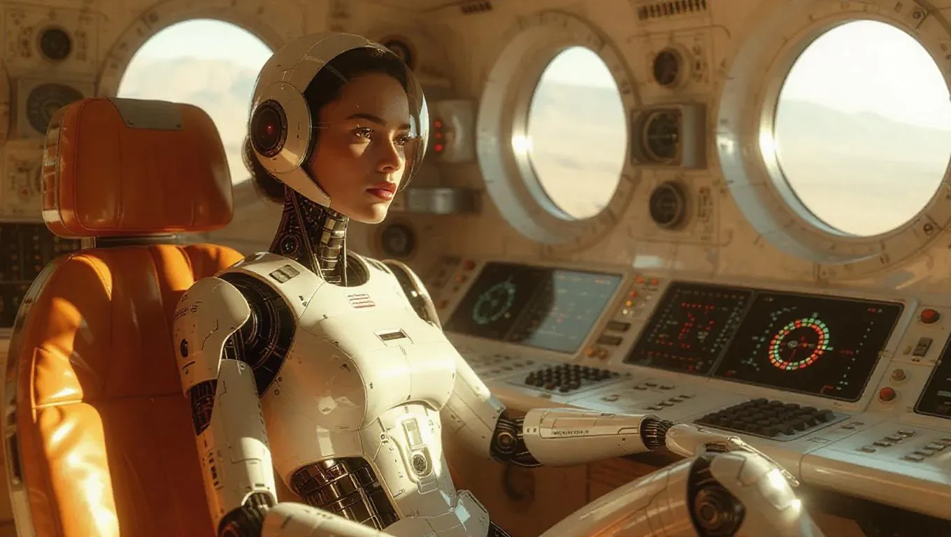 Step into a 1950s retro-futuristic dystopia with this AI-generated scene: a human-cyborg hybrid in a surreal spaceship command center, blending Shaun Tan’s whimsy, Bosch’s eeriness, and Beksinski’s dystopia. Ultra-realistic textures, rich colors, strange distortions, and cinematic daylight evoke opulent eeriness. Perfect for AI art enthusiasts seeking surreal, techno-advanced visuals inspired by retro sci-fi masterpieces.