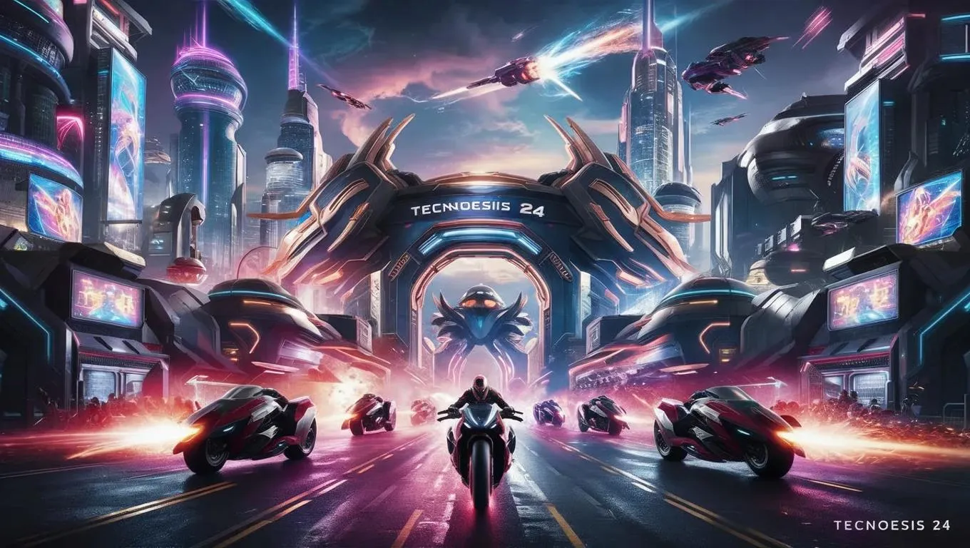 Explore the AI-generated futuristic cityscape of TECNOESIS 24 with neon-lit skyscrapers, holographic ads, and the glowing OASIS-inspired gate. Dive into a vibrant nightscape alive with hoverbike races, clashing mechas, and electrifying danger. Create immersive, cinematic visuals using vivago.ai's AI tools for dynamic, professional-grade sci-fi backdrops and action-packed virtual worlds.