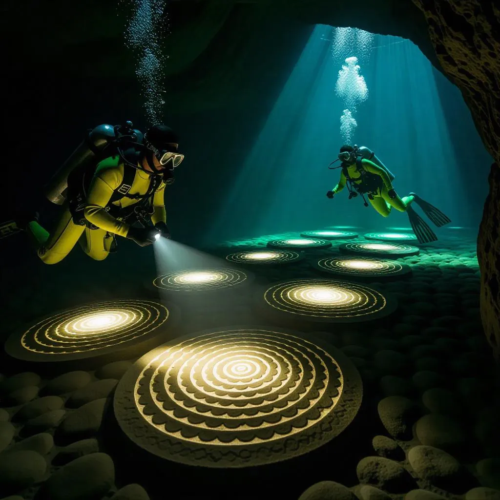 Explore an AI-generated underwater scene with scuba divers in yellow wetsuits studying ancient glowing stone slabs in a submerged chamber. Golden-lit carvings, algae-covered walls, and rising air bubbles create a mysterious atmosphere. Perfect for AI art enthusiasts seeking professional-grade visuals of sunken ruins and enigmatic aquatic exploration.