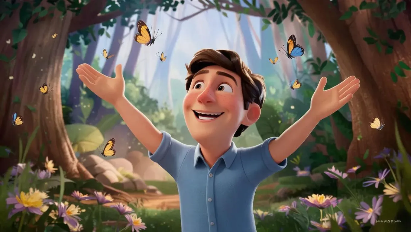 Create a Pixar-style AI-generated image of a joyful man admiring vibrant butterflies in an enchanted forest. Perfect for whimsical animation lovers, this AI art generator combines playful character design with lush nature scenes for lively, professional-grade visuals. Ideal for storytelling or digital art projects.
