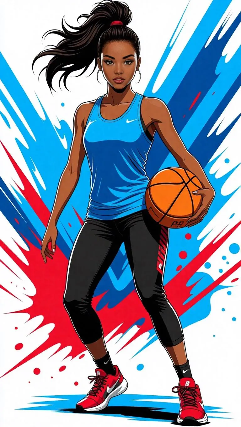 Create a vibrant AI-generated digital illustration of a dynamic basketball player: young woman in blue tank top, black pants, and red sneakers, mid-action with a high ponytail. White backdrop bursts with bold blue-red splashes, amplifying energy. Perfect for sports visuals, social media, or ads—crafted with vivago.ai's AI tools for professional-grade, high-impact imagery.