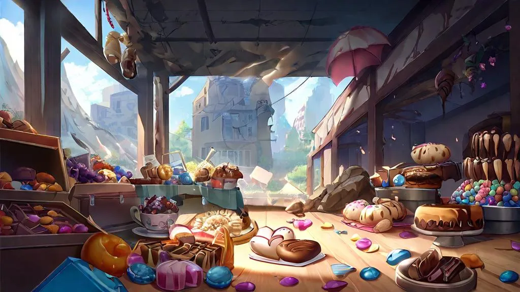 Generate apocalyptic AI visuals of sweets hoarding in dystopian landscapes. Transform text prompts into vivid post-apocalyptic scenes with vivago.ai's AI image tools, blending candy-colored chaos and eerie end-times aesthetics. Create surreal, professional-grade visuals of decadent survivalism in crumbling worlds.