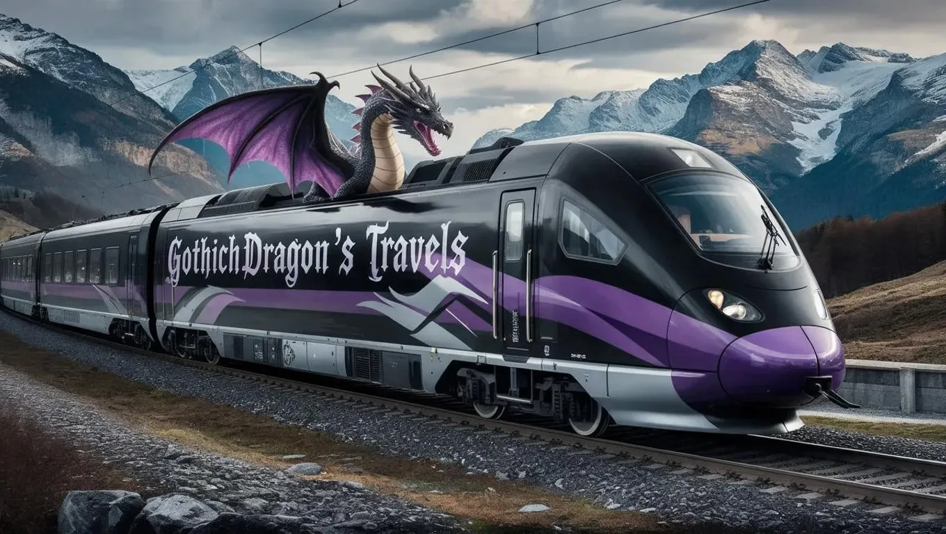 Create AI-generated art of a gothic dragon transforming into a high-speed train racing through European mountains. VivaGo.ai blends fantasy and futurism with black, purple, and silver accents, graffiti details, and surreal scenery. Perfect for dynamic, imaginative designs powered by AI image tools. Turn mythical concepts into striking visual stories effortlessly.