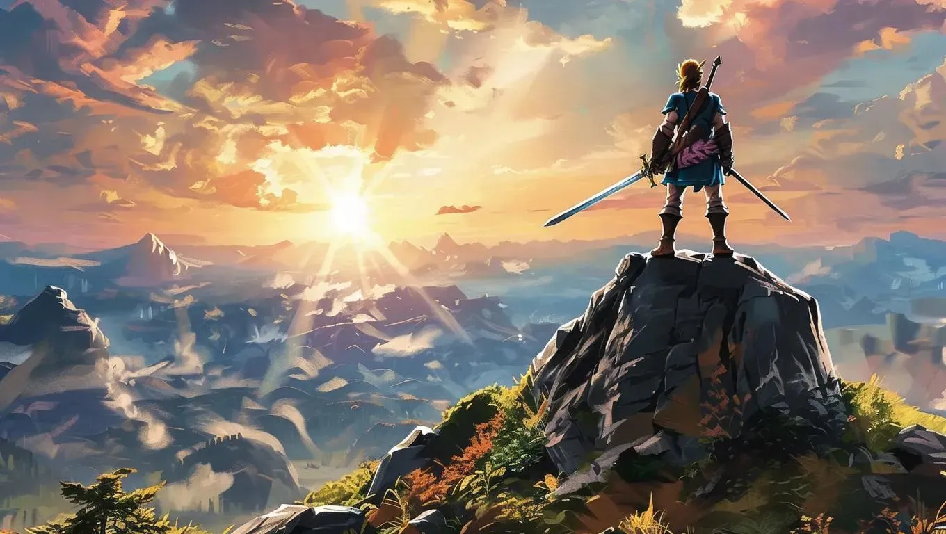 AI-generated art of a majestic warrior on a mountain edge, wielding a gleaming sword. Golden sunset glow, vibrant orange-pink skies, and lush forest landscapes. Create epic fantasy visuals with AI effects, chiseled features, and professional editing tools for stunning, battle-hardened character designs.