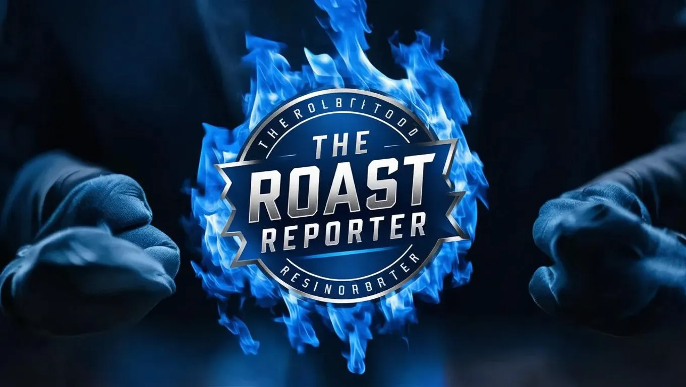 Create a fierce 'The Roast Reporter' logo with blazing blue fire effects, sharp dynamic lines, and bold typography. Ideal for edgy branding, viral content-ready visuals, and fiery social media identities. Powered by AI-driven design tools for precision, intensity, and maximum impact.