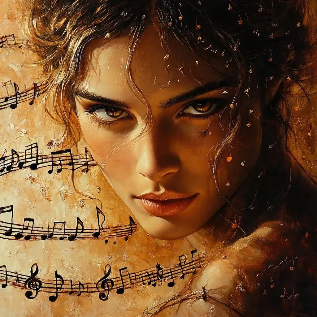 Create a mesmerizing AI-generated portrait blending music and art. Features a soulful subject adorned with intricate, glowing music chords, bathed in soft warm lighting. Harmonious fusion of emotion and melody, with muted backgrounds highlighting ethereal details. Perfect for music-inspired visuals, album art, or creative storytelling. Crafted with precision for enchanting, professional-grade results.
