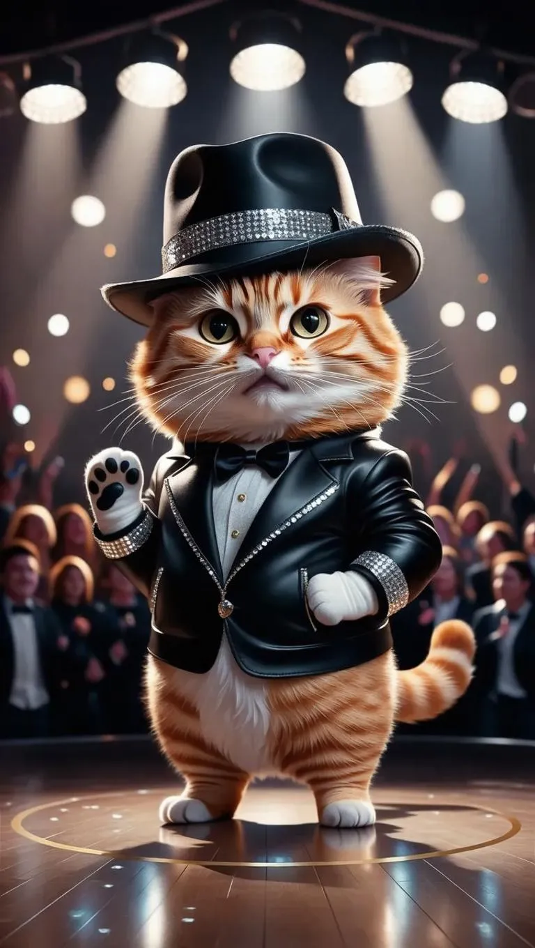 Vivid AI-generated image of a cute chubby orange cat in a Michael Jackson-inspired outfit—black fedora, sequined jacket, and white glove. Realistic HD photo captures playful charm on a spotlighted concert stage with blurred audience lights. Transform ideas into visual masterpieces with vivago.ai's professional AI effects and creative tools.