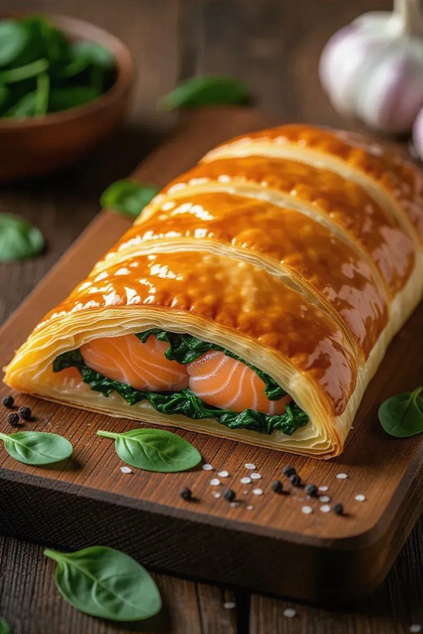 Create a mouthwatering baked salmon fillet with spinach in flaky puff pastry. Professional stock photo-style close-up captures rustic elegance. Perfect for food blogs, recipe sites, or culinary branding. High-res AI-generated image emphasizes golden crust, vibrant greens, and gourmet plating. Ideal for chefs, content creators, and food marketers.