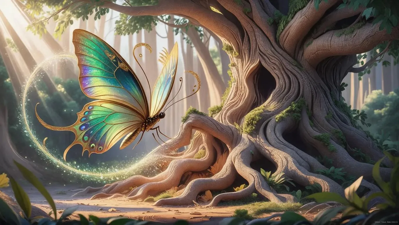 Create a manga-style AI-generated image of a vibrant green butterfly with yellow accents tumbling near an ancient gnarled tree. Features weathered bark textures and soft dappled sunlight for striking artistic contrast. Explore VivaGo.ai's AI tools for professional-grade visual transformations and creative effects.