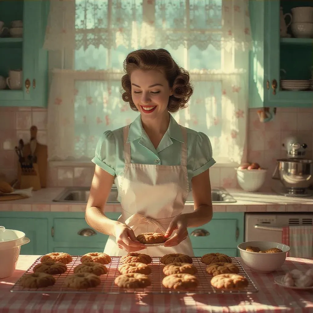Generate retro 1950s pop-up art with vivago.ai's AI tools. Craft nostalgic scenes of a woman baking cookies in vintage style, blending papercraft charm and mid-century aesthetics for dynamic AI visuals. Perfect for retro-inspired creative projects.