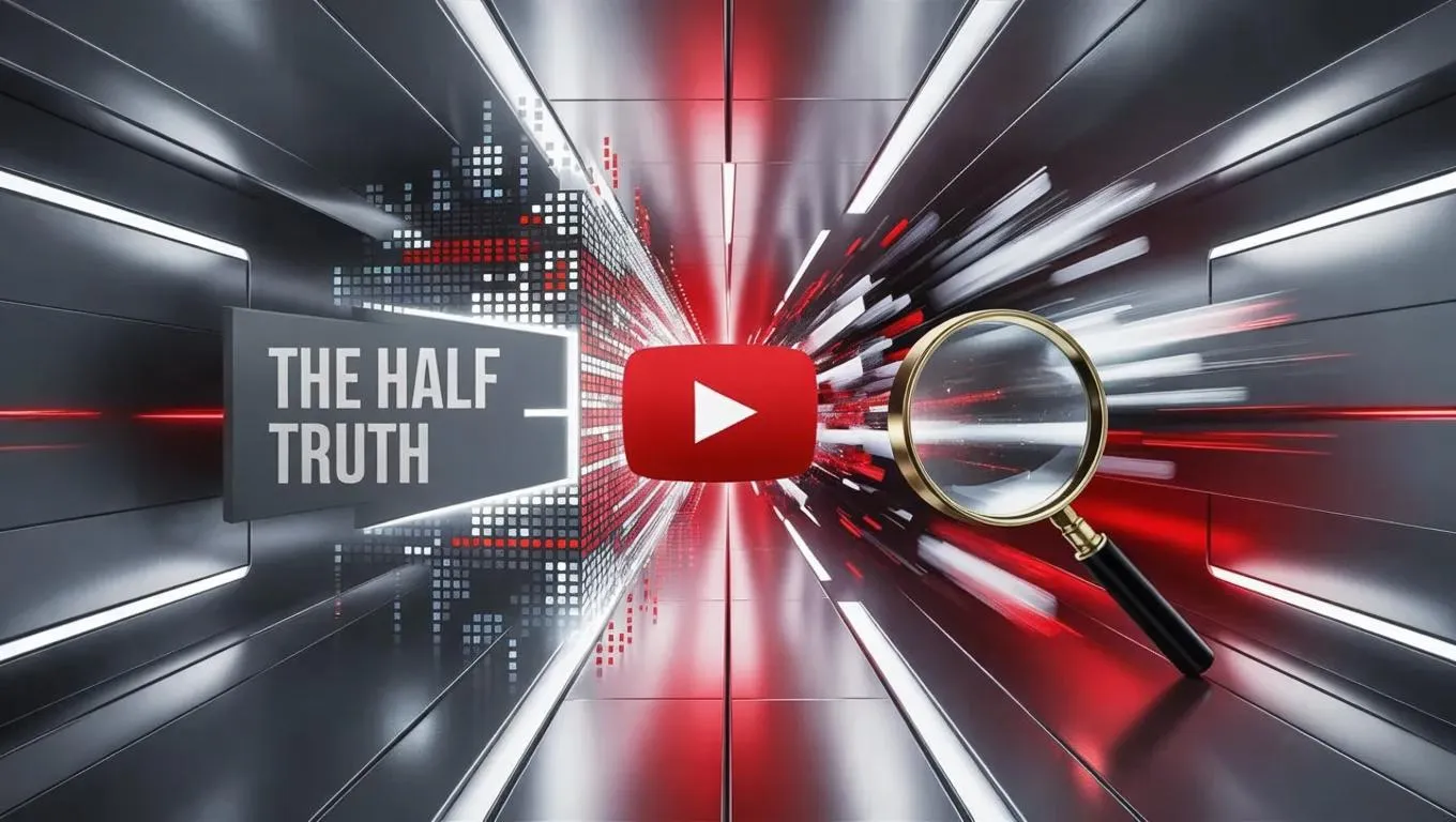 Craft a bold YouTube banner for 'The Half Truth' channel exploring Indian politics. Futuristic design merges a digital grid, crisp text, magnifying glass (clarity) with static blur (misinformation). Dark gray, white, red accents evoke urgency. Modern typography highlights the name; tagline "Breaking Through the Noise" reinforces truth-seeking. Ideal for news, current affairs—AI-powered visuals balance investigative themes and striking symbolism.