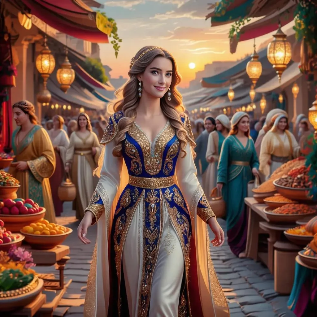 Generate stunning AI images of a Byzantine lady in a bustling market, adorned in an elegant gold-embroidered gown under warm lantern light. Vivago.ai crafts captivating romantic fantasy scenes with dynamic lighting, vibrant details, and professional editing tools for mesmerizing visual storytelling.