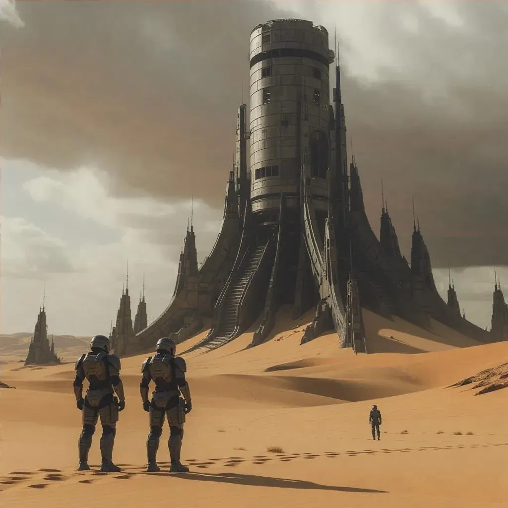 Generate futuristic sci-fi scenes with AI. Craft armored figures in a post-apocalyptic desert landscape, towering metallic structures, and dramatic skies. Vivago.ai transforms text prompts into professional-grade visuals using advanced AI tools for immersive, detailed imagery.