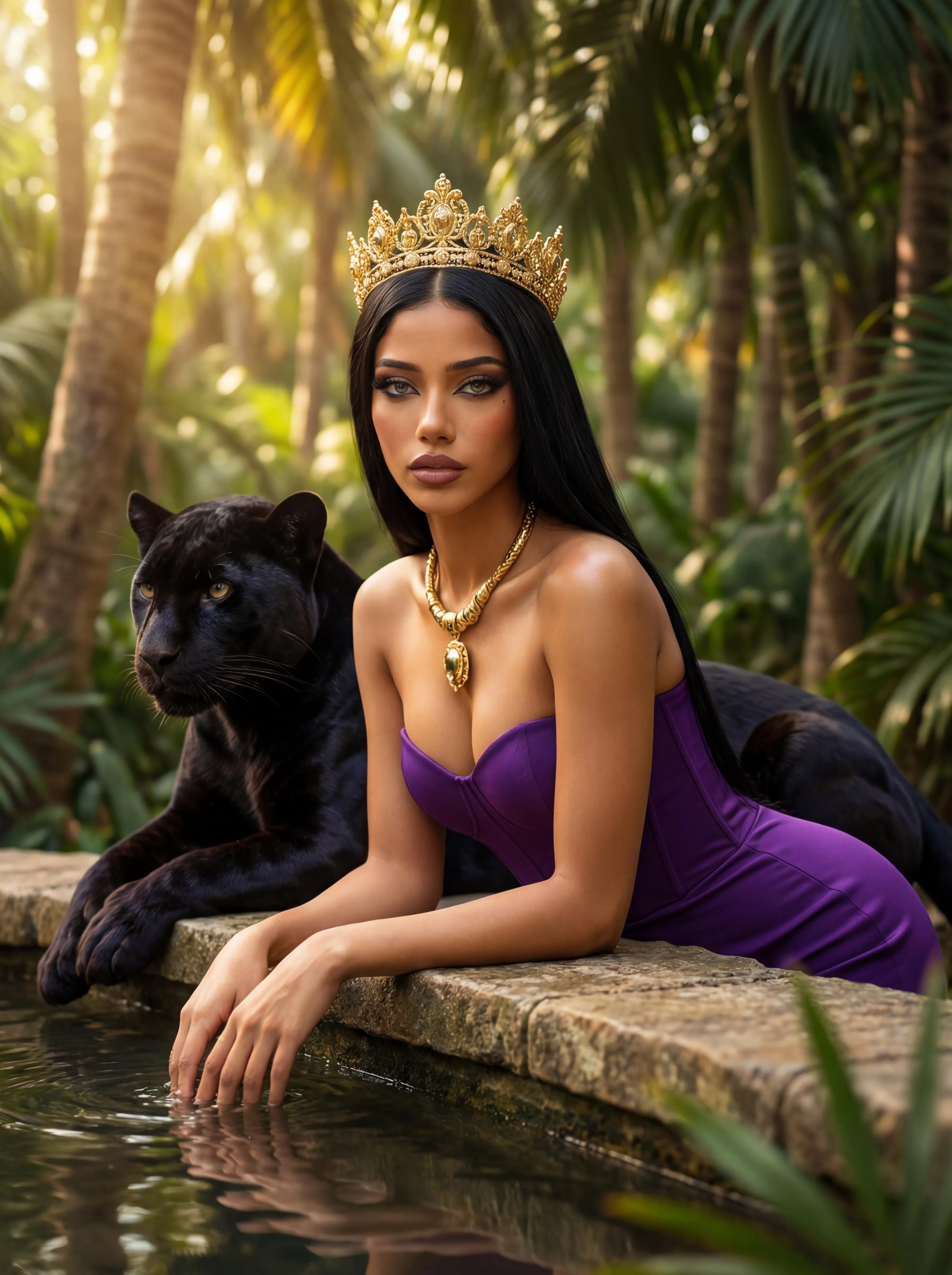 Create hyper-realistic jungle queen AI portraits with vivago.ai. Generate a powerful, regal woman with sleek black hair in a striking purple dress, adorned with gold crown & necklace, alongside a majestic black panther. Lush tropical jungle setting with cinematic lighting & vibrant colors. Transform your vision into professional fantasy art.