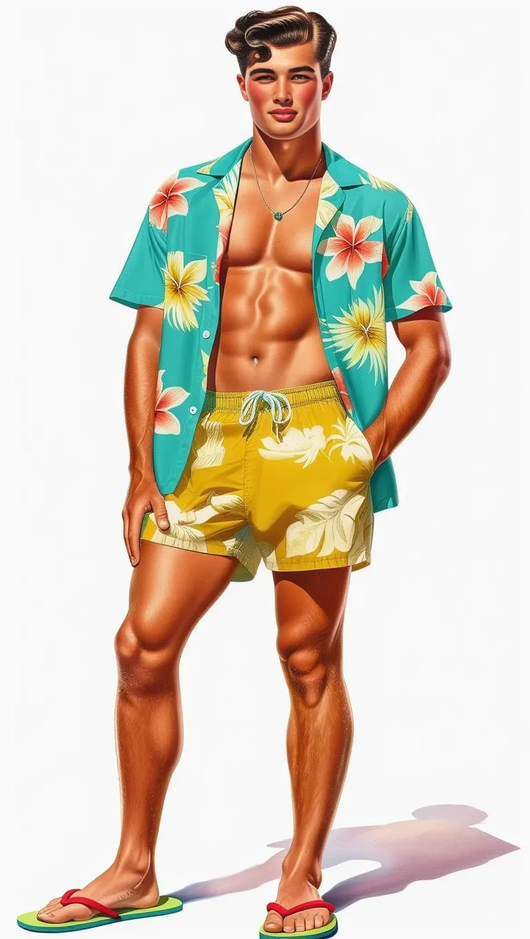 Create a vintage 1960s-themed AI illustration of a handsome brunette male in a Hawaiian shirt, swim trunks, and flip-flops. Featuring ombre-blended aqua blue, mustard yellow, coral, avocado green, and cream tones. Hyper-realistic, photo-quality full-body view isolated on white. Generate retro-inspired visuals with vivago.ai's advanced AI tools for professional-grade creative projects.