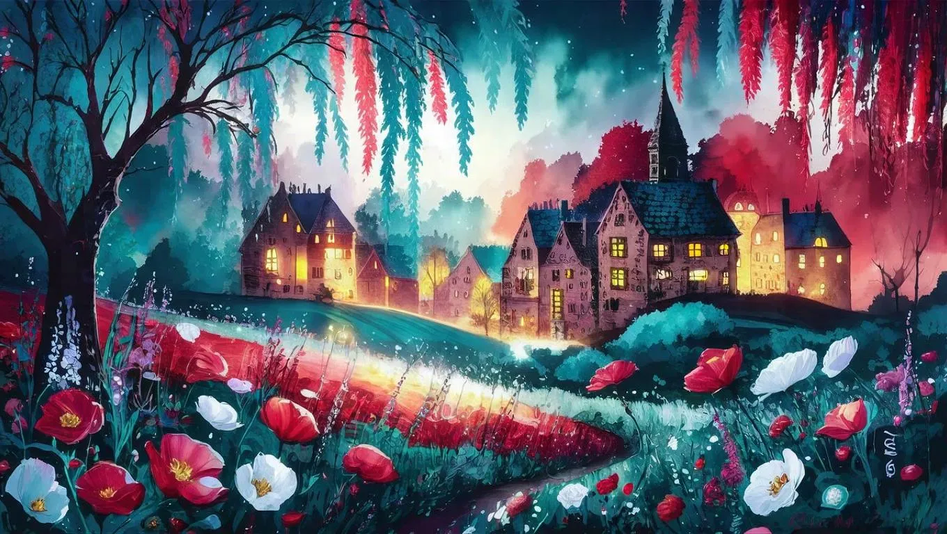 Create a dreamy pastel drawing with AI, inspired by Rosso Emerald Crimson’s style. Craft an ethereal village scene under a weeping willow, blending red, turquoise, and white hues with cool blue glow. Enhance vibrant meadows and floral details using AI Watercolor effects for whimsical, luminous landscapes. Perfect for serene, artistic visuals.